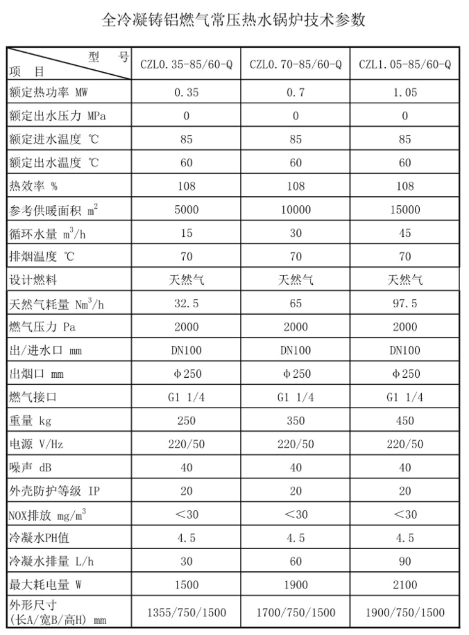 全預(yù)混低氮冷凝鑄鋁燃?xì)忮仩t源自歐洲,氮氧化物排放低于30mg/m3,優(yōu)于 嚴(yán)環(huán)保標(biāo)準(zhǔn)。排煙溫度接近回水溫度, 低可至35℃,選用PVC煙管。綜合節(jié)能40%以上,變頻輸出的調(diào)節(jié)范圍從15%~ ,使熱量輸出更加 。采用世界 的水、火逆流結(jié)構(gòu)設(shè)計(jì),熱效率高,體積小,采用輪式底座,運(yùn)輸方便,能使鍋爐安裝在房間,節(jié)省鍋爐房面積。1噸冷凝燃?xì)忮仩t占地面積僅2m2,供暖面積可達(dá)10000 m2。